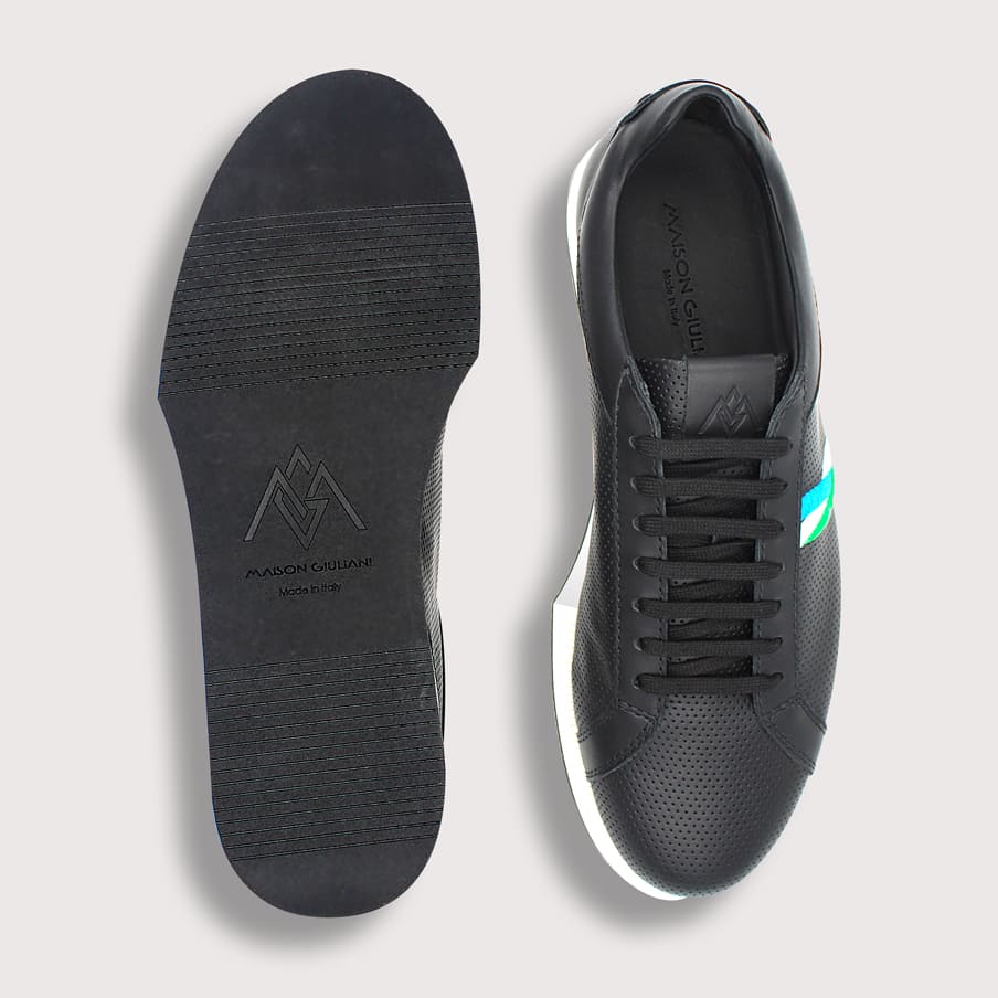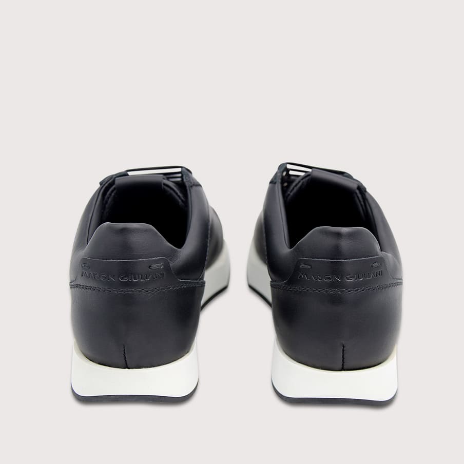 Le logo MG en noir est apposé sur une étiquette en cuir cousue sur la languette. À l’arrière, l’inscription MAISON GIULIANI en noir signe le modèle.
