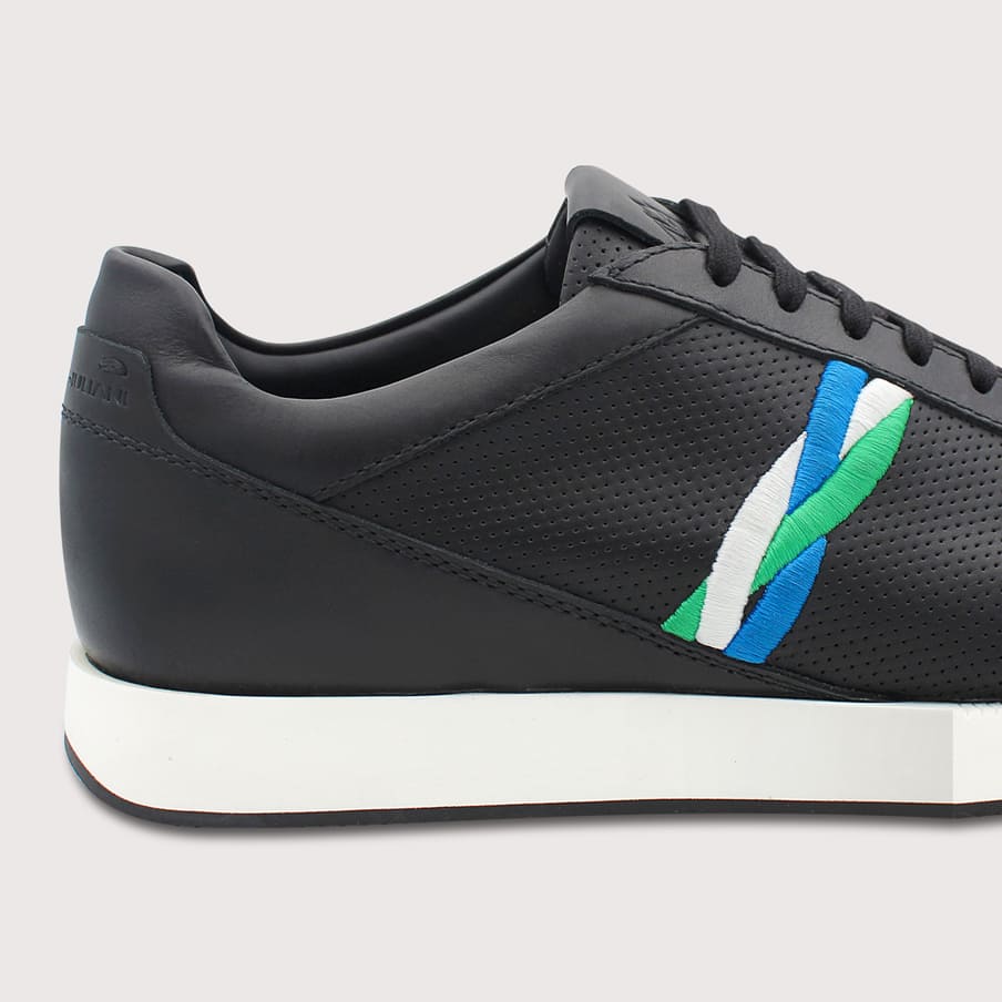 Sneakers basses au design raffiné, confectionnées en cuir de veau lisse noir, sublimées par des empiècements en cuir de veau perforé noir qui offrent à la fois légèreté et élégance.