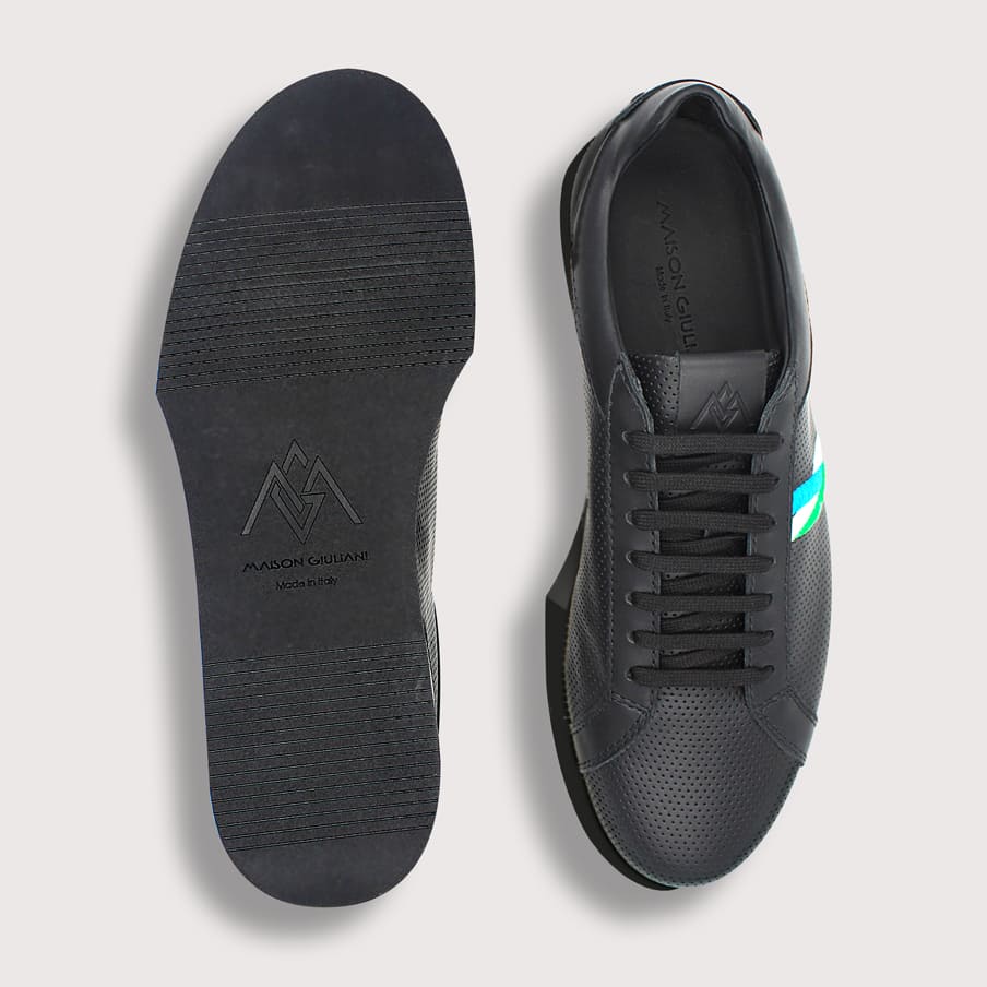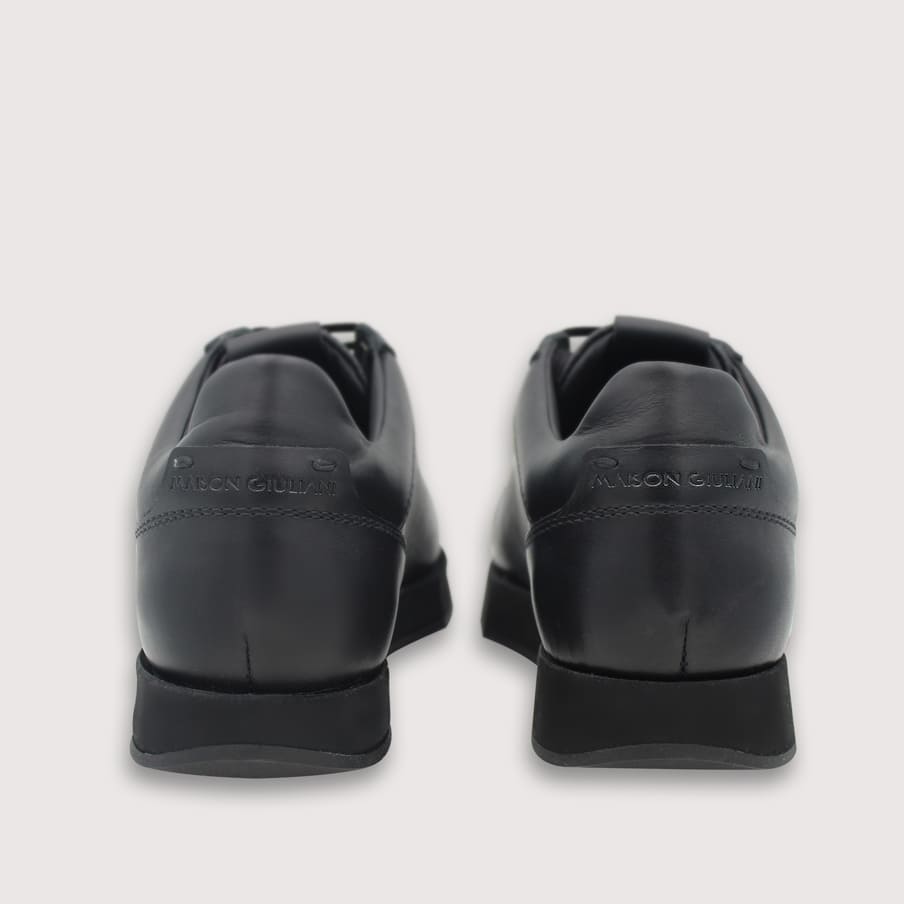 Le logo MG en noir est apposé sur une étiquette en cuir cousue sur la languette. À l’arrière, l’inscription MAISON GIULIANI en noir signe le modèle.
