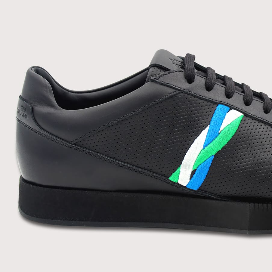 Sneakers basses au design raffiné, confectionnées en cuir de veau lisse noir, sublimées par des empiècements en cuir de veau perforé noir qui offrent à la fois légèreté et élégance.